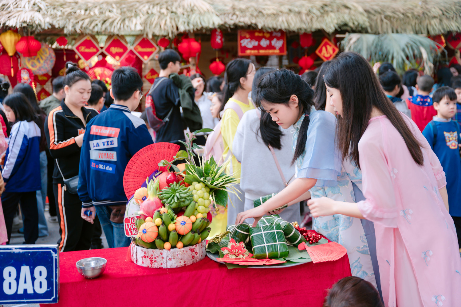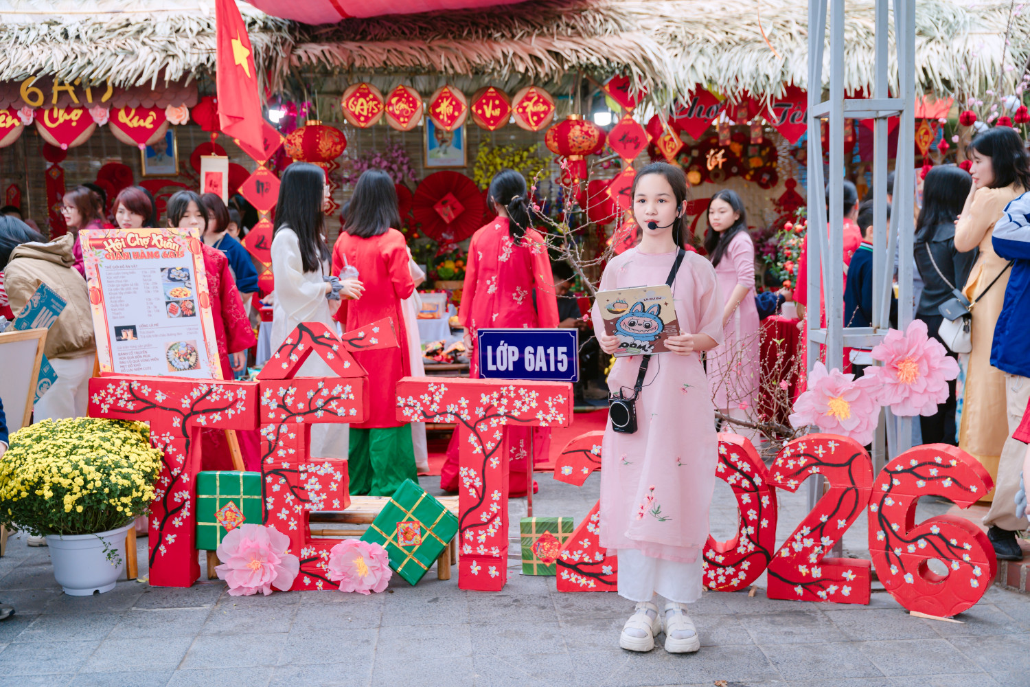 Ngay từ sáng sớm, toàn bộ khuôn viên trường đã được thay áo mới. Những khóm hoa đào, hoa mai khoe sắc bên cạnh những gian hàng lá cọ, tre nứa được trang trí tỉ mỉ bằng câu đối đỏ, lồng đèn và những dải lụa rực rỡ. Tiếng nhạc xuân rộn ràng hòa cùng tiếng cười nói của thầy cô, phụ huynh và học sinh tạo nên một bầu không khí náo nức, báo hiệu một mùa xuân mới đang về rất gần. Hội chợ năm nay không chỉ đơn thuần là nơi mua sắm mà còn là một không gian trải nghiệm thực tế đầy ý nghĩa: