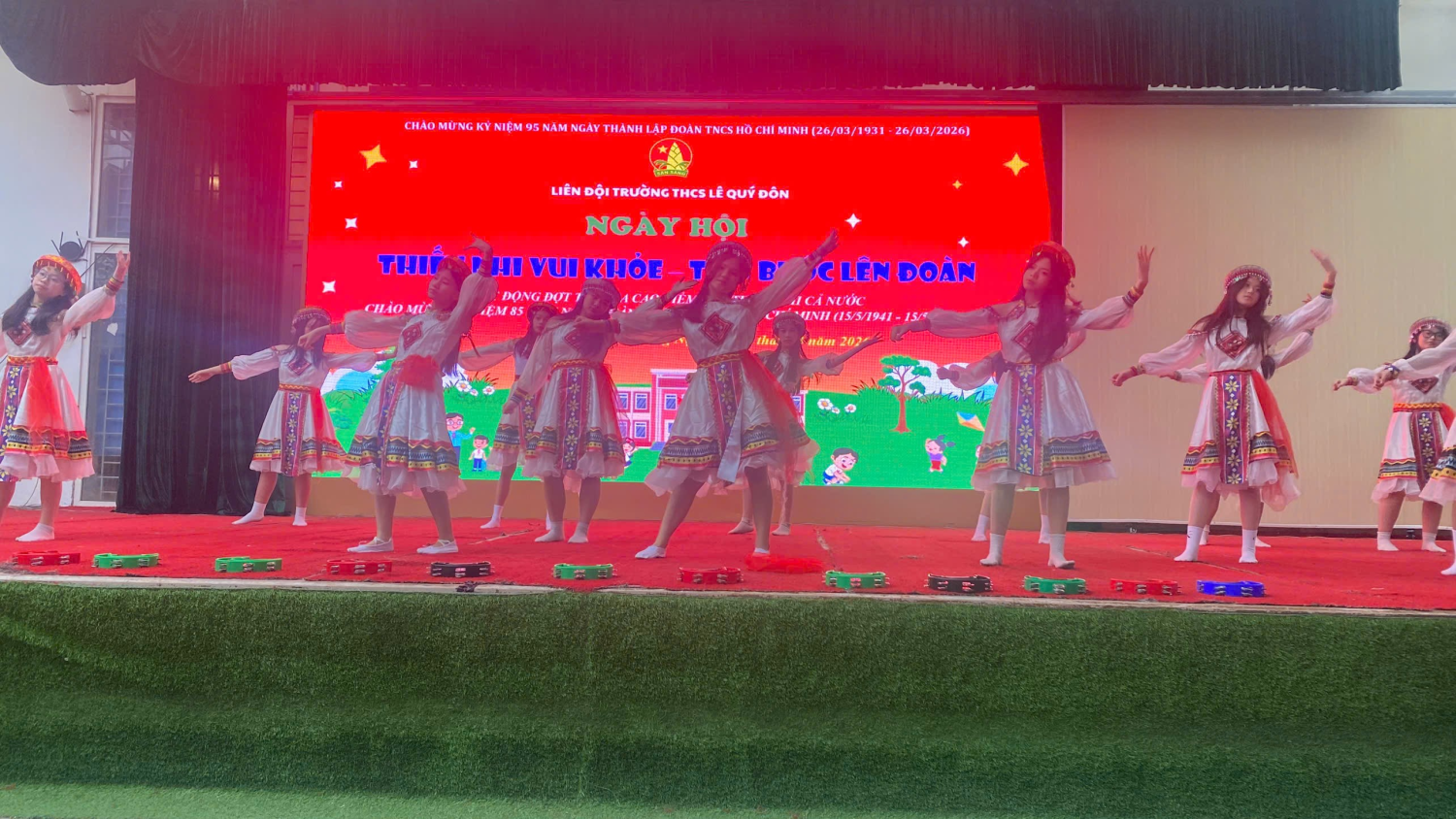 3. Màn thi nhảy sạp đầy màu sắc và sôi động từ các em học sinh lớp 7: Không gian sân trường THCS Lê Quý Đôn như bừng sáng và rộn ràng hơn bao giờ hết khi những bộ sạp được trang trí rực rỡ bằng dải lụa màu sắc, hoa văn thổ cẩm và cờ hoa rực rỡ. Các em học sinh lớp 7 xuất hiện trong những trang phục truyền thống của các dân tộc Mông, Thái, Mường... với đủ màu sắc xanh, đỏ, vàng, tím, tạo nên một bức tranh văn hóa đa dạng và sống động. Giữa các lớp có những màn thi nhảy sạp rất ấn tượng. Tạo dấu ấn và không khí vui tươi của ngày Hội.