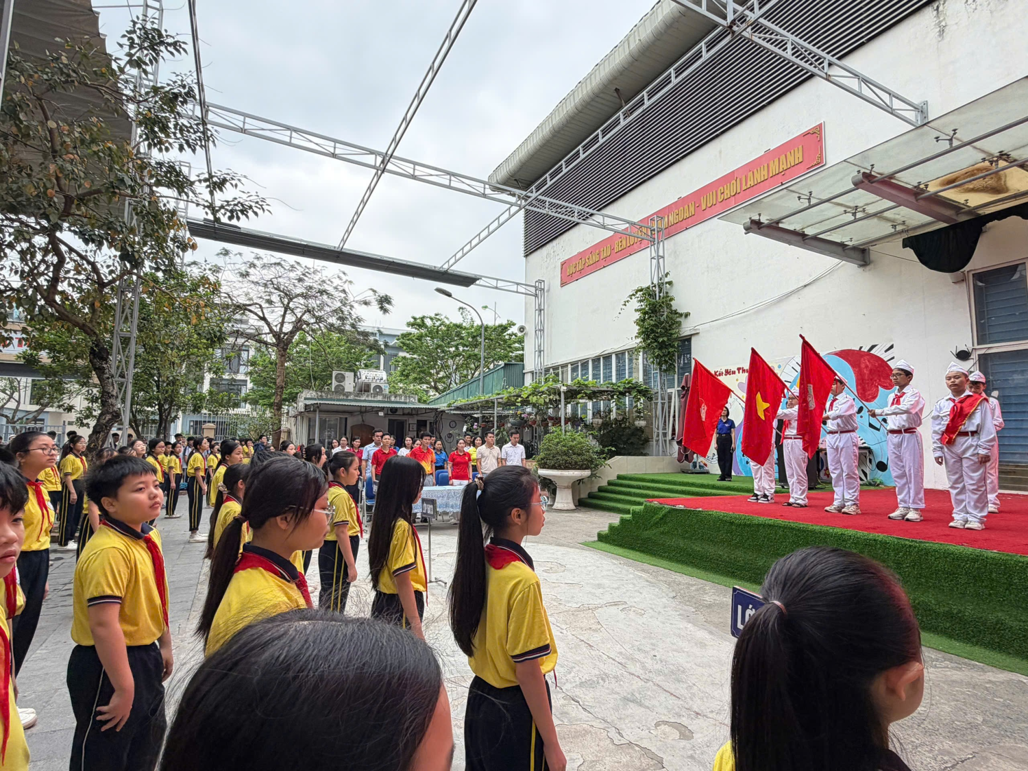 Ngay từ sáng sớm, sân trường đã được nhuộm đỏ bởi màu khăn quàng và sắc áo đồng phục. Buổi lễ bắt đầu trang trọng với lễ chào cờ theo nghi thức Đội, nhắc nhở mỗi bạn học sinh về truyền thống vẻ vang của Đoàn TNCS Hồ Chí Minh. Phát biểu khai mạc, cô Hiệu trưởng nhấn mạnh: