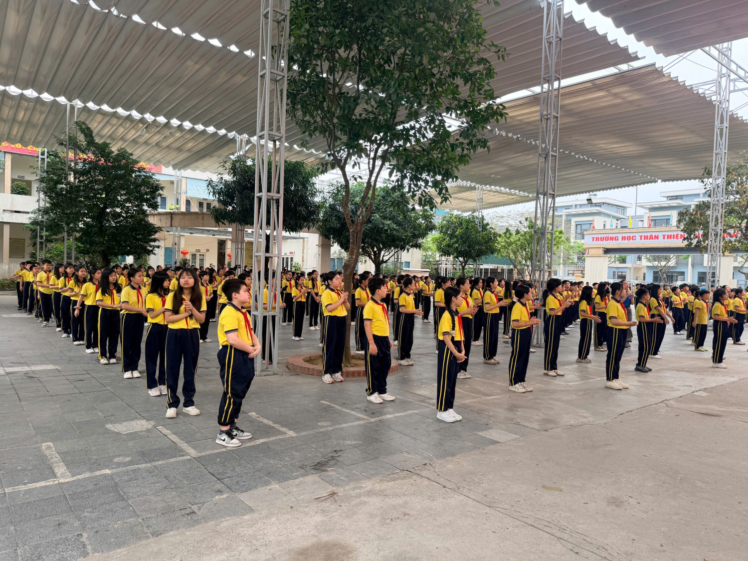 1. Màn đồng diễn của các em HS khối 6: Một trong những khoảnh khắc làm "bùng nổ" sân trường chính là màn đồng diễn đến từ các em học sinh khối 6. Dù mới bước chân vào mái trường THCS, các em đã chứng minh sự tự tin, kỷ luật và tinh thần tập thể tuyệt vời. Những động tác tay dứt khoát, nụ cười tươi rói trên gương mặt và nhịp điệu đều tăm tắp đã khiến các thầy cô, phụ huynh và các anh chị khối trên không khỏi trầm trồ, thán phục. Hàng trăm học sinh cùng thực hiện bài đồng diễn trên nền nhạc trẻ trung, tạo nên một khung cảnh cực kỳ ấn tượng, thể hiện sự đồng lòng và sức trẻ căng tràn.
