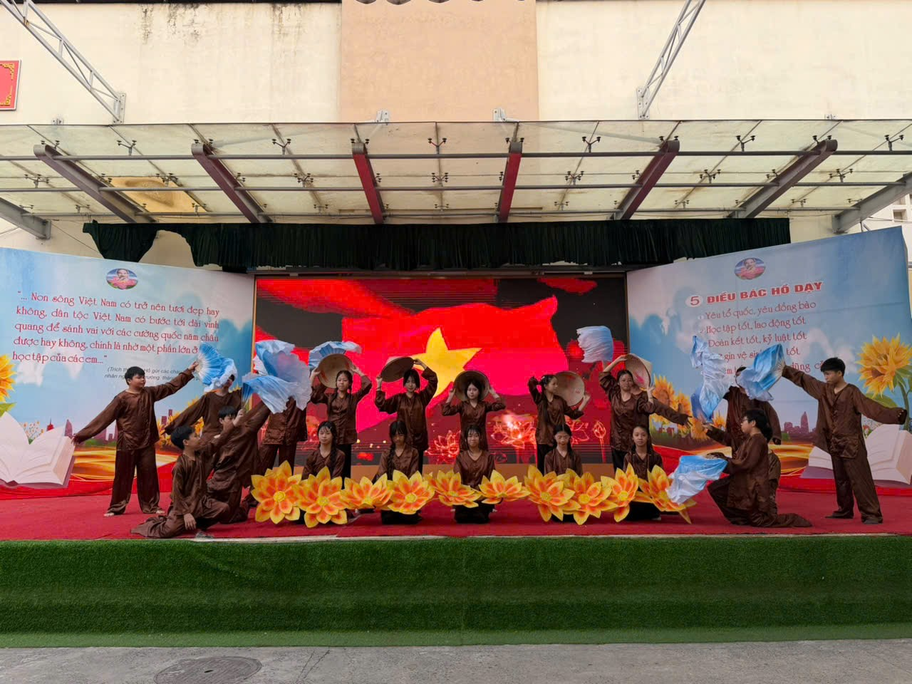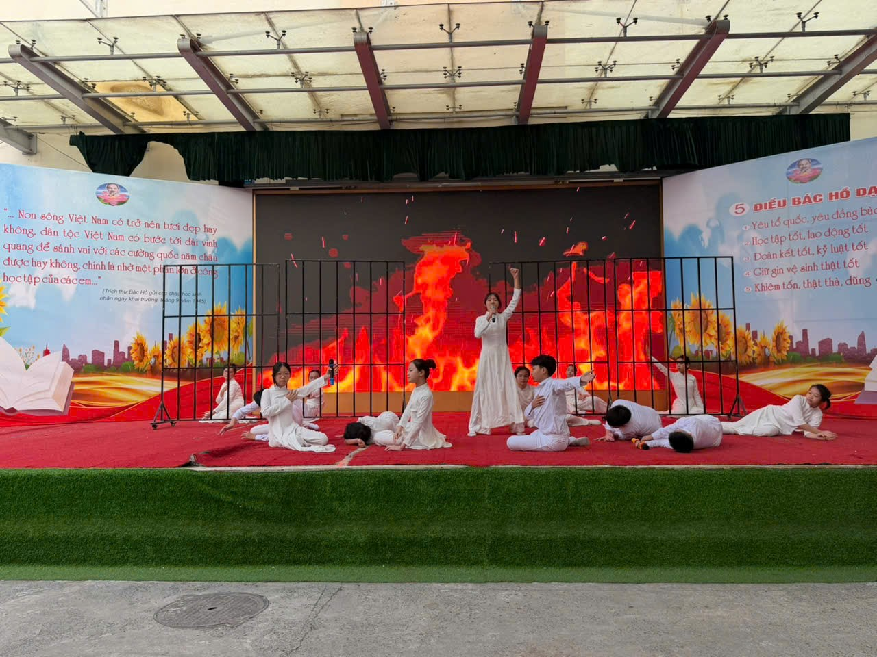 Ngay từ sáng sớm, sân trường đã rực rỡ sắc đỏ của lá cờ Tổ quốc. Không khí buổi lễ thêm phần sôi động với các tiết mục văn nghệ đặc sắc do chính các em học sinh dàn dựng: