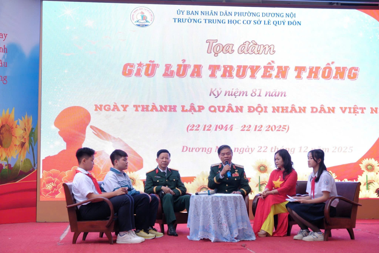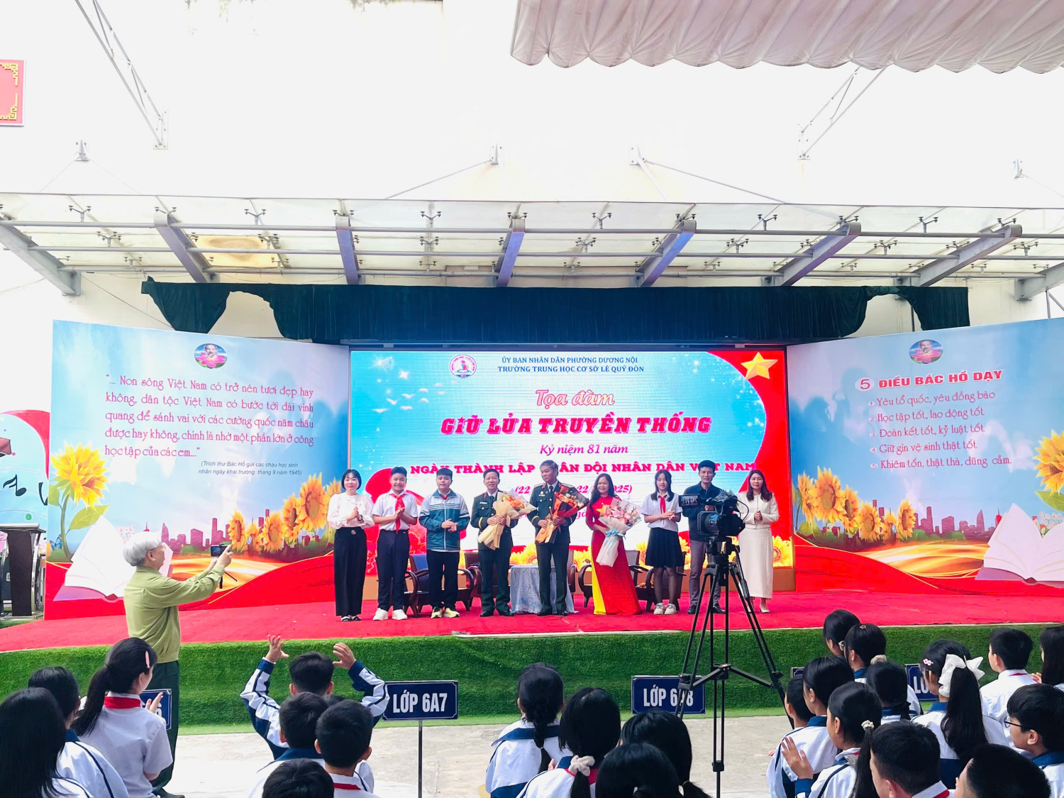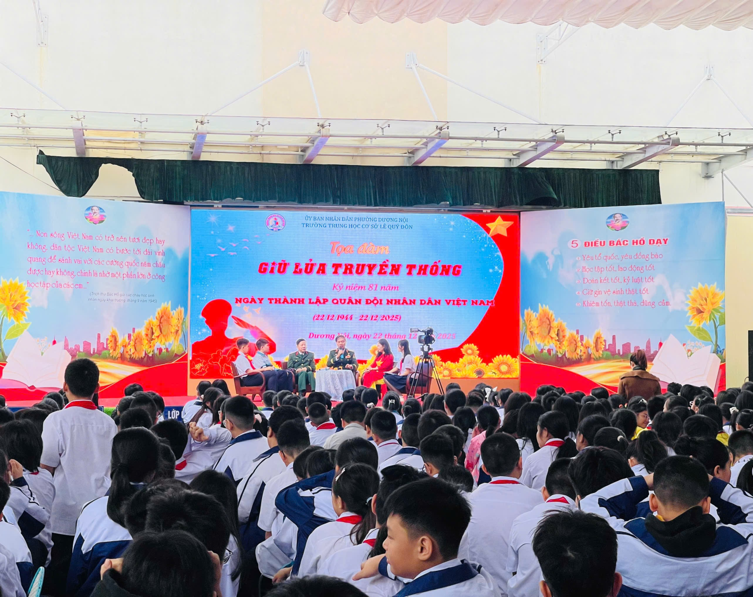 Sáng thứ Hai vừa qua, trong không khí trang nghiêm của buổi lễ chào cờ đầu tuần, thầy và trò trường THCS Lê Quý Đôn đã tổ chức chương trình ngoại khóa với chủ đề Tọa đàm “Tiếp lửa truyền thống”. Đây là hoạt động trọng điểm nằm trong chuỗi sự kiện chào mừng kỷ niệm 81 năm Ngày thành lập Quân đội Nhân dân Việt Nam (22/12/1944 – 22/12/2025).